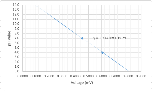 As a result we have two points, therefore we can make a pH value compared to voltage chart. The relation is actually linear, and will enable us to easily return a pH value with the code, instead of a voltage. This gives us the following equation: