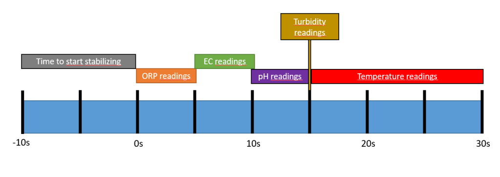 The plan is to dip the device in the water and wait 10 seconds before pushing the “take readings” button, to give the sensors time to stabilize. Then, H2OSupport will take the ORP readings, since we’ve realized it is important to take them quickly. The device will calculate the average ORP value in a matter of nanoseconds. After that, it will procede to take the EC readings, and calculate the average once again. The same steps are true for the pH readings. At around 15 seconds of pressing the “take readings” button, the turbidity readings will be taken. And finally, the temperature readings will be taken. The temperature sensor is solicited last because it is the sensor who’s values take the longest to stabilize.