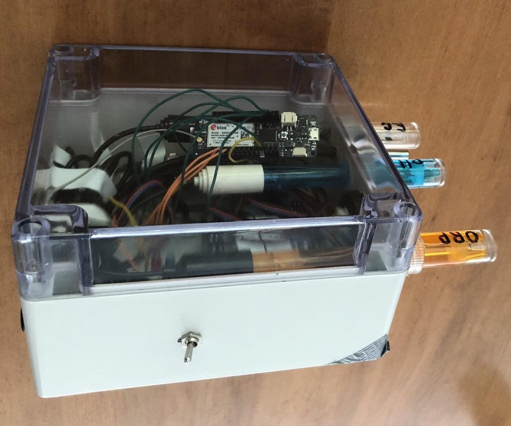 Once turned on, the red LED activates, indicating that the device is currently connecting to a cellular network (~10s). The second blue LED activates once the device is connected and is now taking water quality readings from each sensor (40s). The final yellow LED activates once the device has finished taking readings and is now parsing and sending the data through the cellular network (~10s). The device can now be turned off. The whole process takes around a minute.